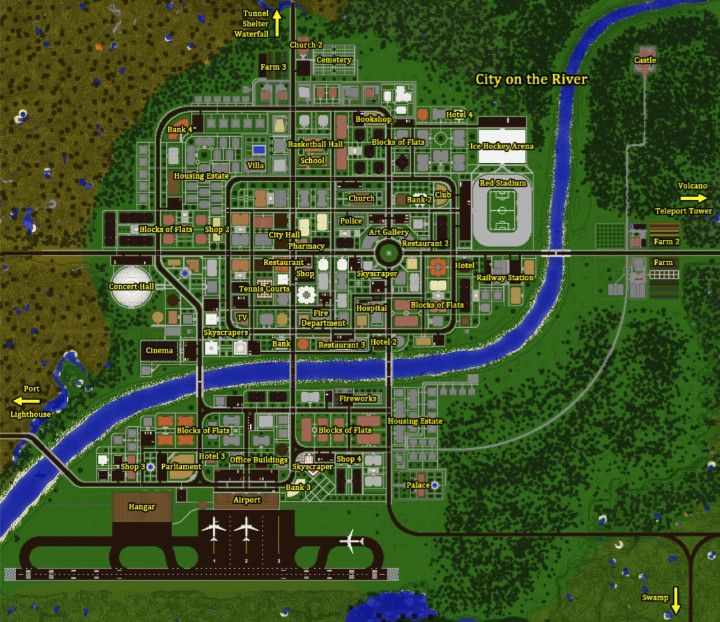 - ย่านอุตสาหกรรม (Industrial Zone): วางไว้ขอบเมืองสำหรับฟาร์มขนาดใหญ่ โรงเก็บของ หรือโรงไฟฟ้ารีดสโตน